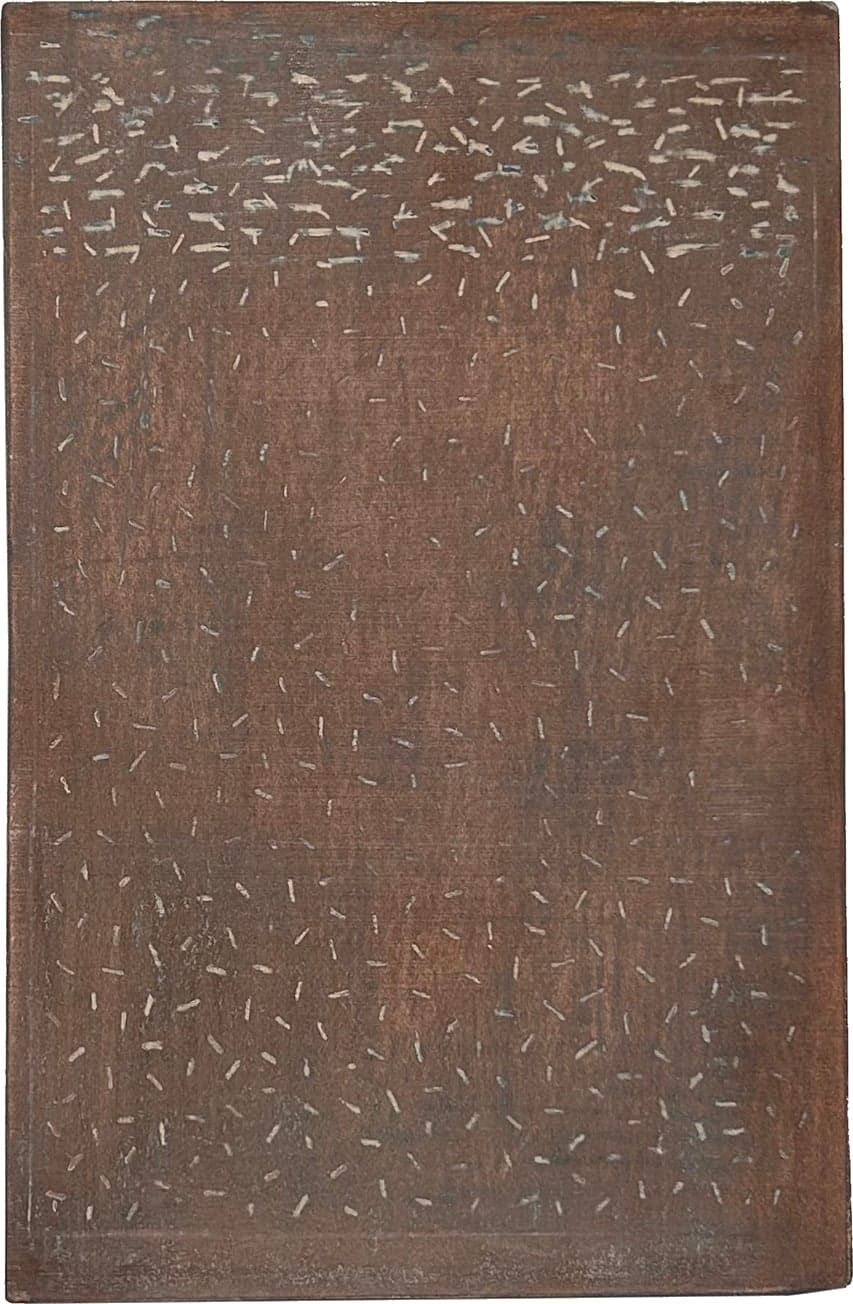 The repeating patterns of lines, dots, and grids, the muted colors, and the worn edges in his works allude to the transience of time. David Quinn always works on several paintings at once, which he sees as signs of the past. For him, they represent a symbol of the time it takes to complete the creative process. David Quinn sees his work as visual haiku, a form of poetry that reflects his deeper thought processes using lines instead of words.