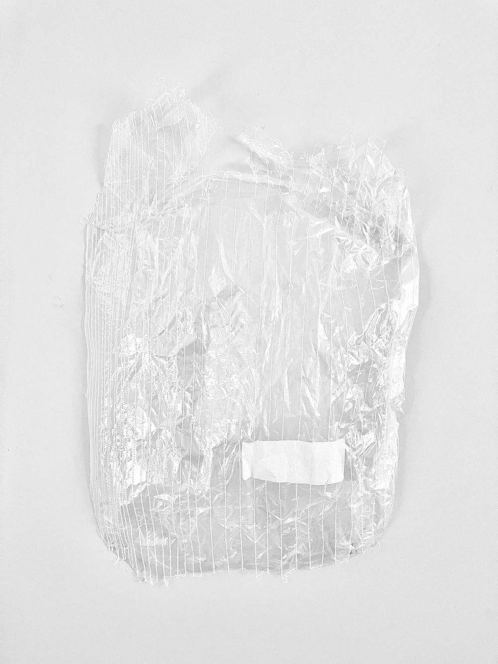 Untitled, 2024, plastic wrap, thread, 54 x 37 x 5 cm.