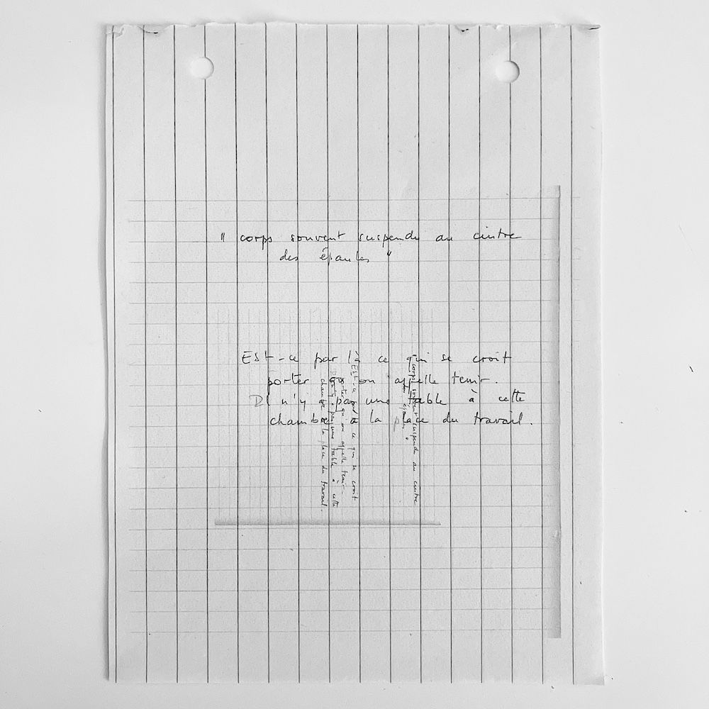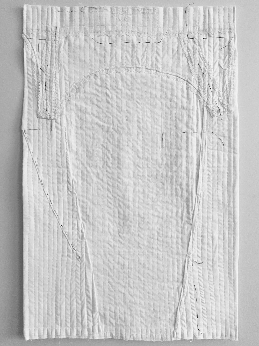 Olga Theuriet puts writing and sewing on the same level. Her research into clothing is explored in Diary texts which give birth to her visual works. In a movement of deep necessity, Olga Theuriet's works seem to give shape to the absence laying at the core of her research. The artist pays particular attention to clothing and its inscription in language and architecture, to its social materiality and to its manufacture. In the context of daily life, her research is articulated as closely as possible to the semantic relationships between text and textile